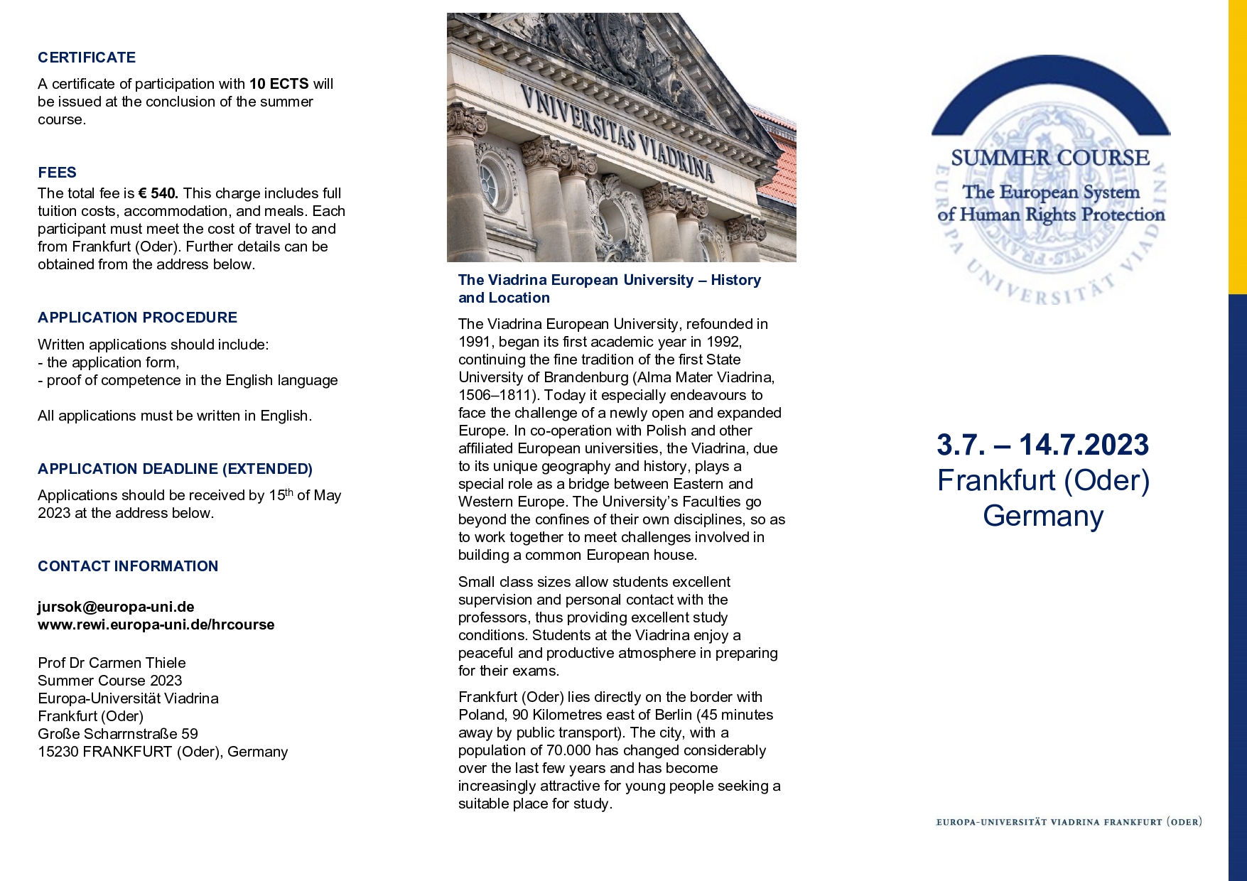 The European University Viadrina (Frankfurt (Oder), Germany) has announced 2023 summer course on the European Convention of Human Rights. See here for information on how to apply. The objective of the course is the following:
