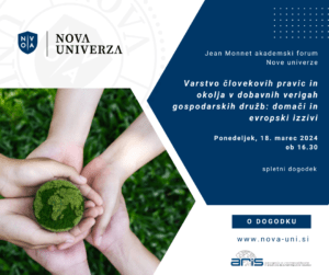 Vljudno vabljeni na Jean Monnet akademski forum Nove univerze, ki bo potekal pod naslovom: Varstvo človekovih pravic in okolja v dobavnih verigah gospodarskih družb: domači in evropski izzivi. Dogodek v slovenskem jeziku bo potekal v ponedeljek, 18. marca 2024, s pričetkom ob 16.30 preko spletne platforme Zoom. Več podrobnosti v vabilu.