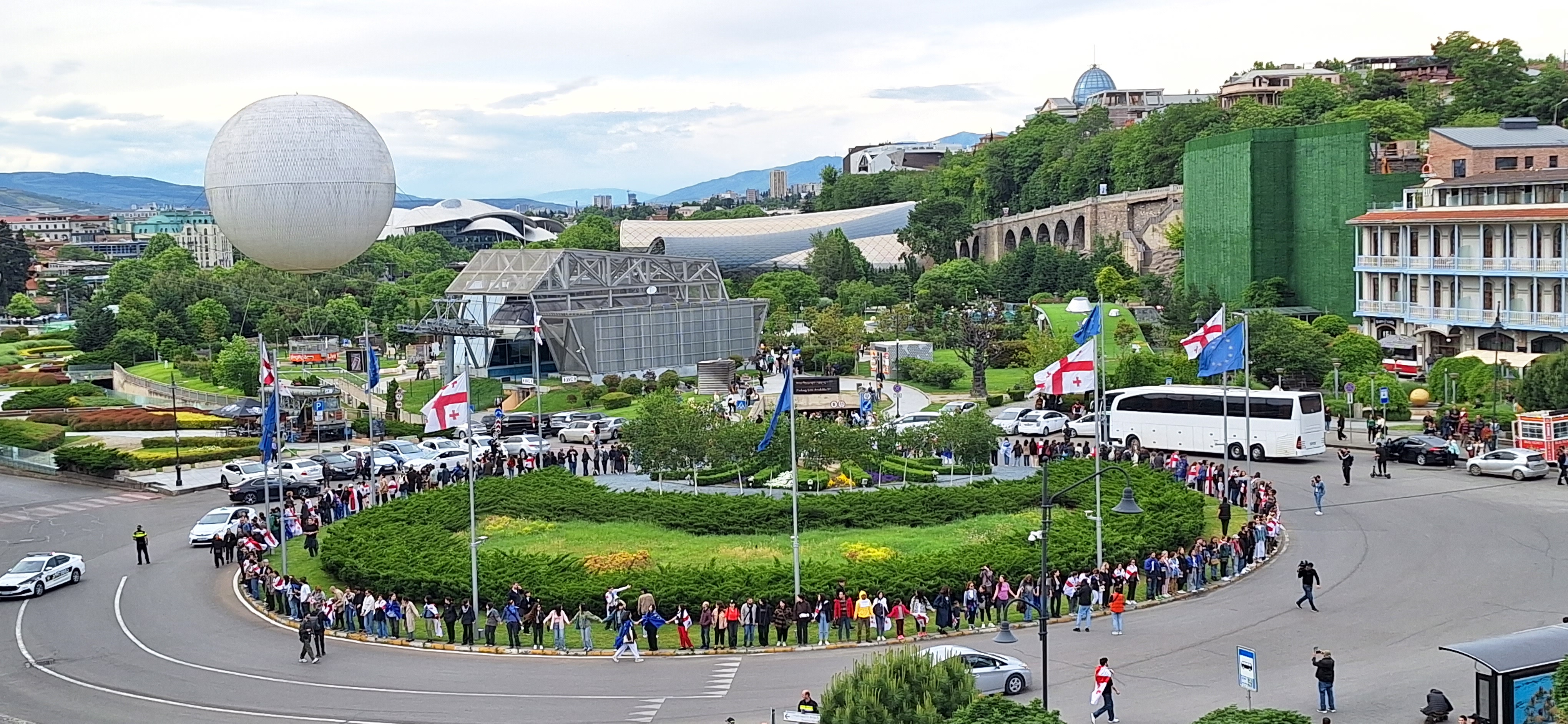 Povzpel sem se do Metekhijeve cerkve Marijinega vnebovzetja, od koder se odpira pogled na stari del Tbilisija, reko Kuro, park Rike in trg Evrope. Po ogledu cerkve se je spodaj na trgu Evropa zaslišala Beethovenova deseta simfonija. Na trgu so se zbrali mladi ljudje, večinoma študenti, v podporo vladavini prava, evropskemu povezovanju in človekovim pravicam ter proti sprejetju t. i. ruskega zakona, ki bi okrepil državni nadzor nad civilnodružbenimi organizacijami. Protesti proti trenutni oblasti so v spomladanskih mesecih postali nekaj običajnega v Tbilisiju. Vzniknili so kot posledica oholosti državnih oblasti, ki so v zadnjih letih svojo absolutno moč razširile v vse institucije gruzijske demokratične in pravne države. Oblast so prevzeli po vzorcu ruskega režima s pomočjo finančnih virov proruskih oligarhov, ki kljub bolečim ranam zaradi ruske kolonizacije dobršnega dela ozemlja gruzijske države bogatijo predvsem v sodelovanjem z ruskim gospodarstvom in vladajočimi oblastmi.