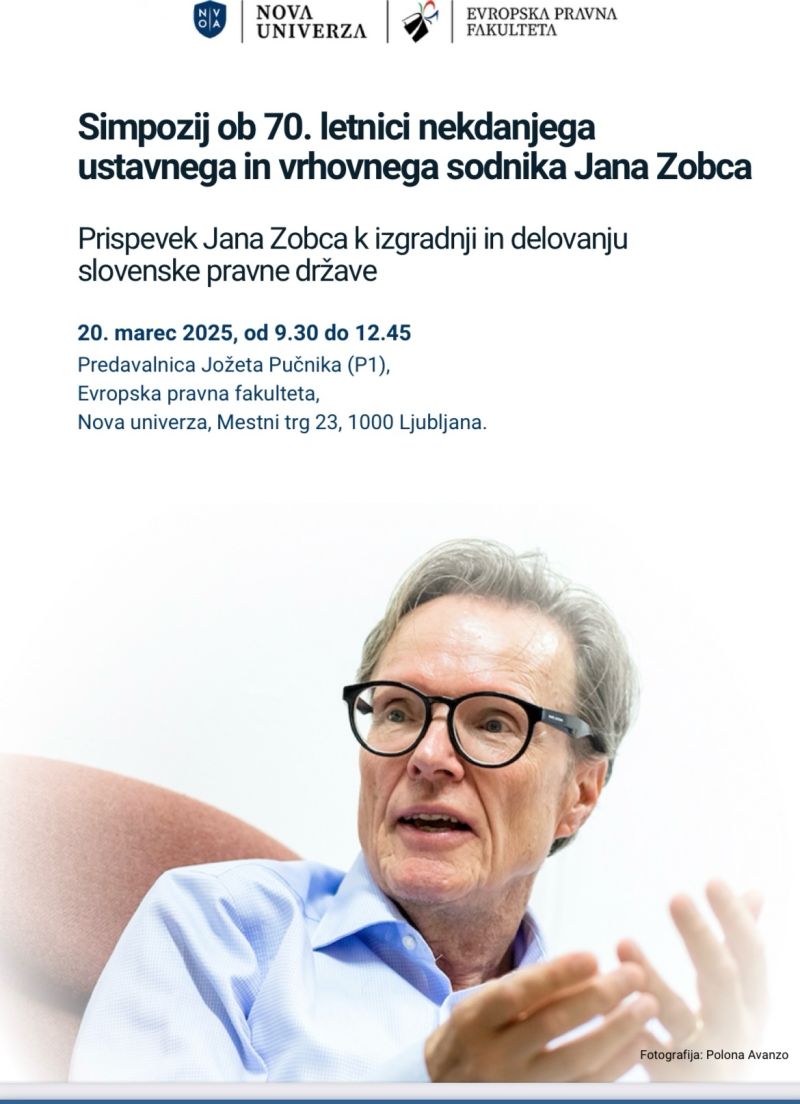 Evropska pravna fakulteta Nove univerze vabi 20. marca 2025 na simpozij z naslovom Prispevek Jana Zobca k izgradnji in delovanju slovenske pravne države, ki bo posvečen bogati pravni karieri in intelektualnemu doprinosu nekdanjega ustavnega in vrhovnega sodnika Jana Zobca. Prijava in več informacij na naslednji povezavi: https://epf.nova-uni.si/dogodki/simpozij-ob-70-letnici-nekdanjega-ustavnega-in-vrhovnega-sodnika-jana-zobca/.