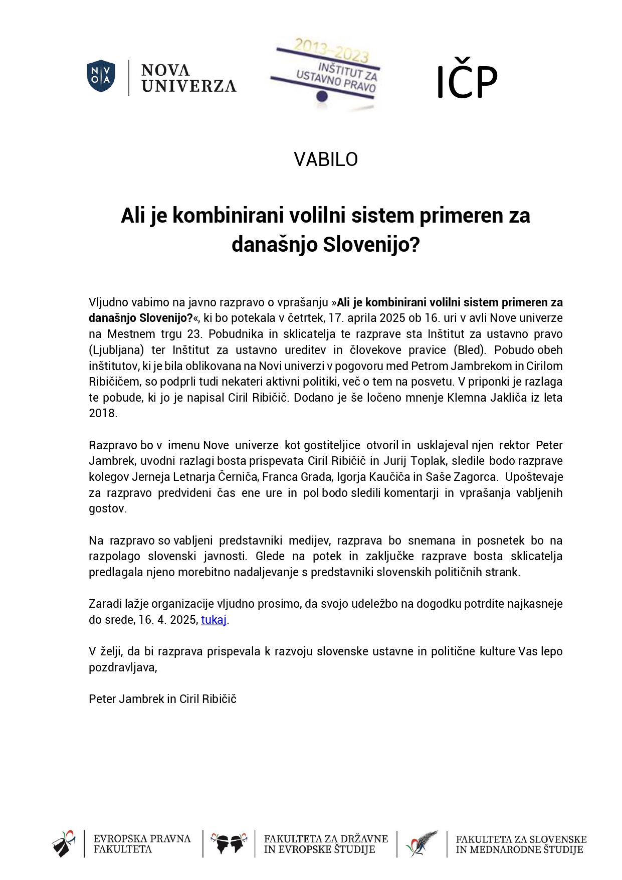 Vljudno vabljeni na javno razpravo o vprašanju »Ali je kombinirani volilni sistem primeren za današnjo Slovenijo?«, ki bo potekala v četrtek, 17. aprila 2025 ob 16. uri v avli Nove univerze na Mestnem trgu 23. Pobudnika in sklicatelja te razprave sta Inštitut za ustavno pravo (Ljubljana) ter Inštitut za ustavno ureditev in človekove pravice (Bled). Pobudo obeh inštitutov, ki je bila oblikovana na Novi univerzi v pogovoru med Petrom Jambrekom in Cirilom Ribičičem, so podprli tudi nekateri aktivni politiki, več o tem na posvetu.