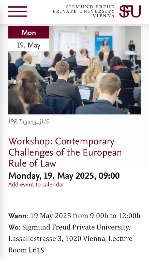 Today, I am attending a workshop on Contemporary Challenges of the European Rule of Law organised jointly by Sigmund Freud PrivatUniversität Wien and Nova univerza. I will be discussing recent challenges to the rule of law in Slovenia. Thank you to Konrad Lachmayer and Matej Avbelj, for organising this event.