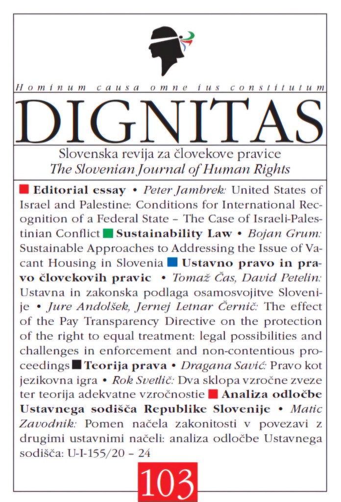 We are pleased to announce the publication of the latest issue of Dignitas – Slovenian Journal of Human Rights (no. 103). This issue features articles on various dimensions of international law, constitutional, human rights and sustainability law. At Dignitas, we are committed to strengthening human rights capacity and knowledge in Slovenia, Central and Eastern Europe, and beyond. Many thanks to editors, reviewers and authors.