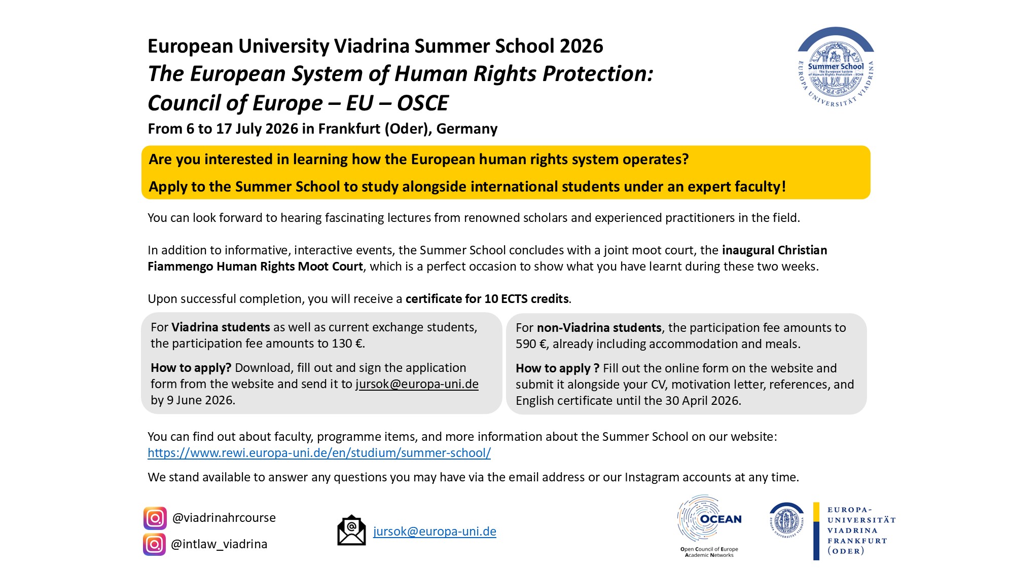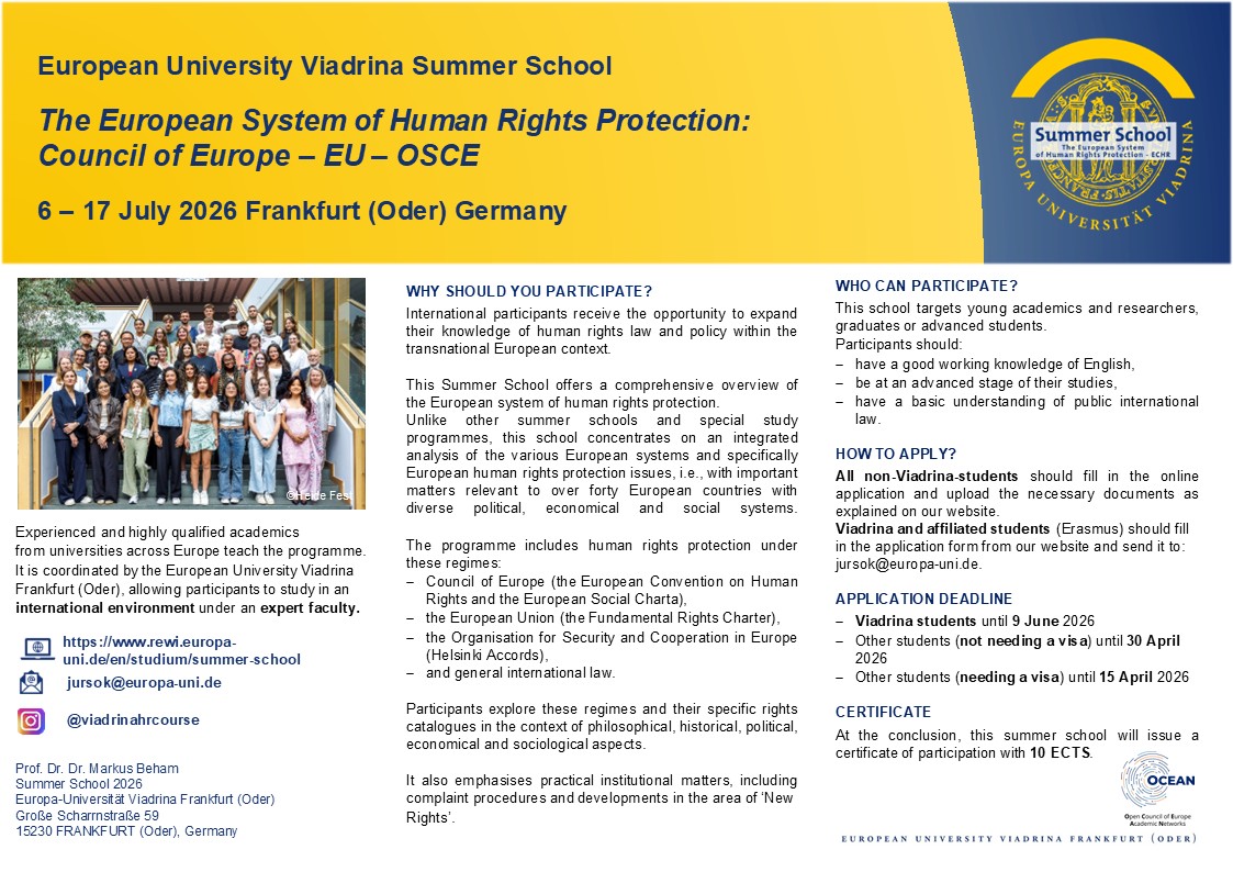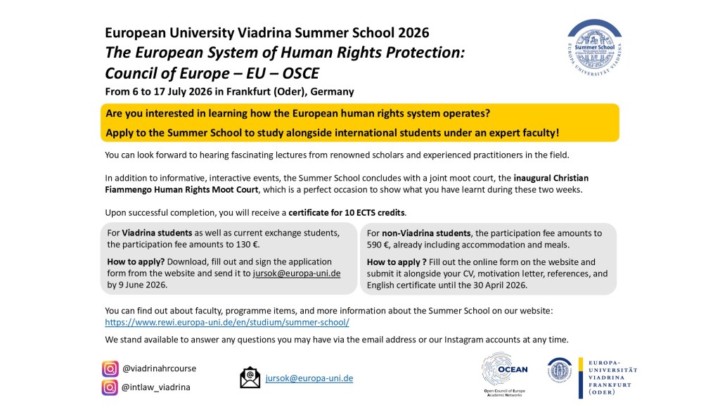 The European University Viadrina (Frankfurt (Oder), Germany) has announced a 2026 summer course on the European Convention of Human Rights. See here for information on how to apply.